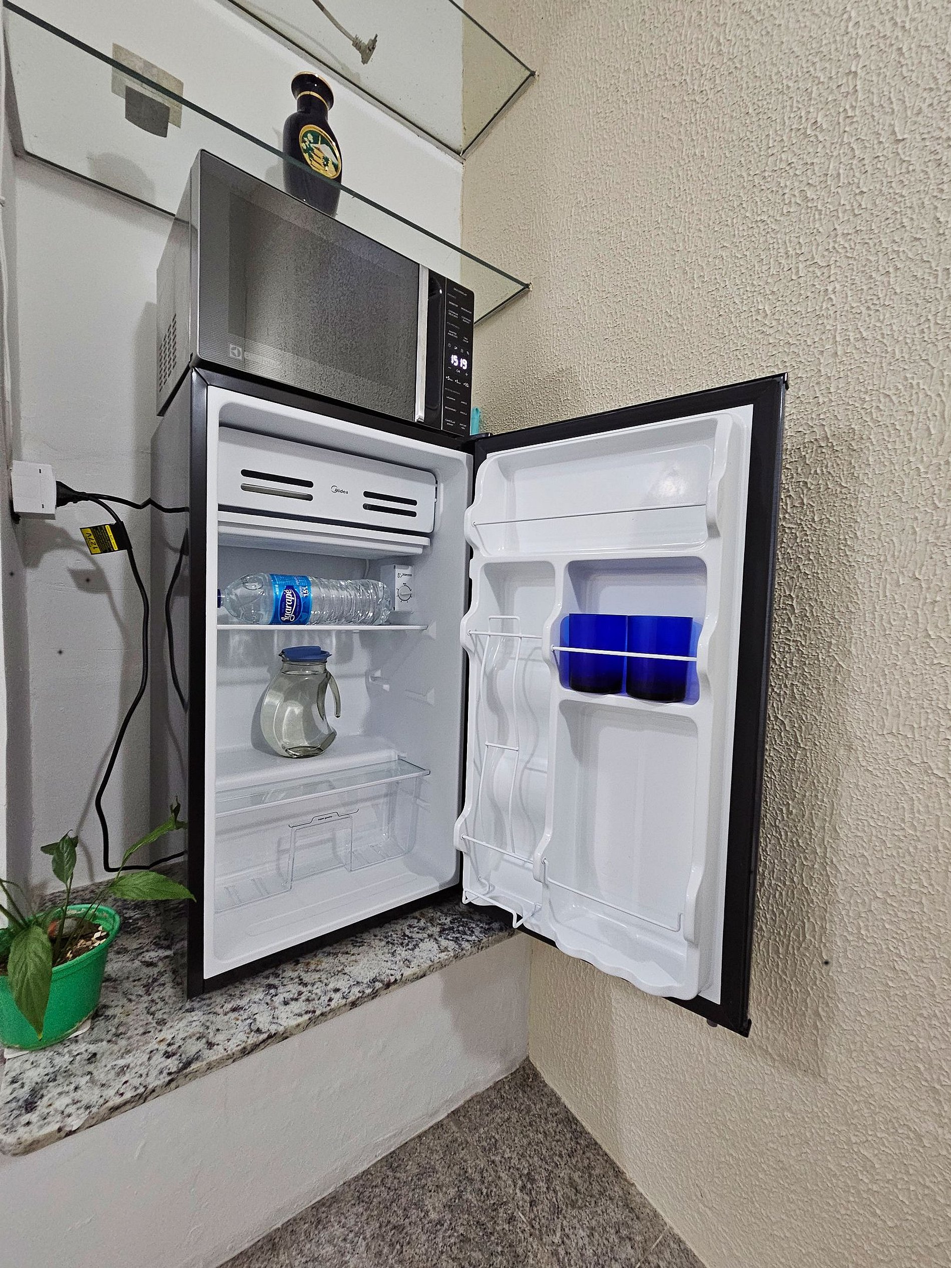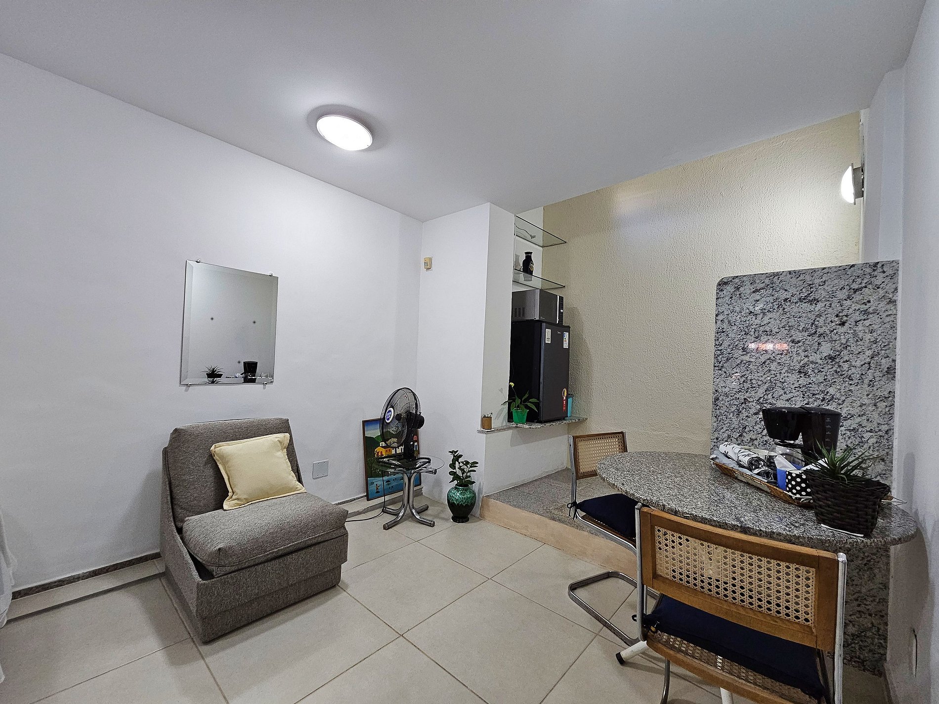 • Comodidades Modernas: Para sua conveniência, o estúdio está equipado com uma cafeteira, ventilador, microondas, frigobar e secador de cabelo, garantindo que você tenha tudo o que precisa à mão.