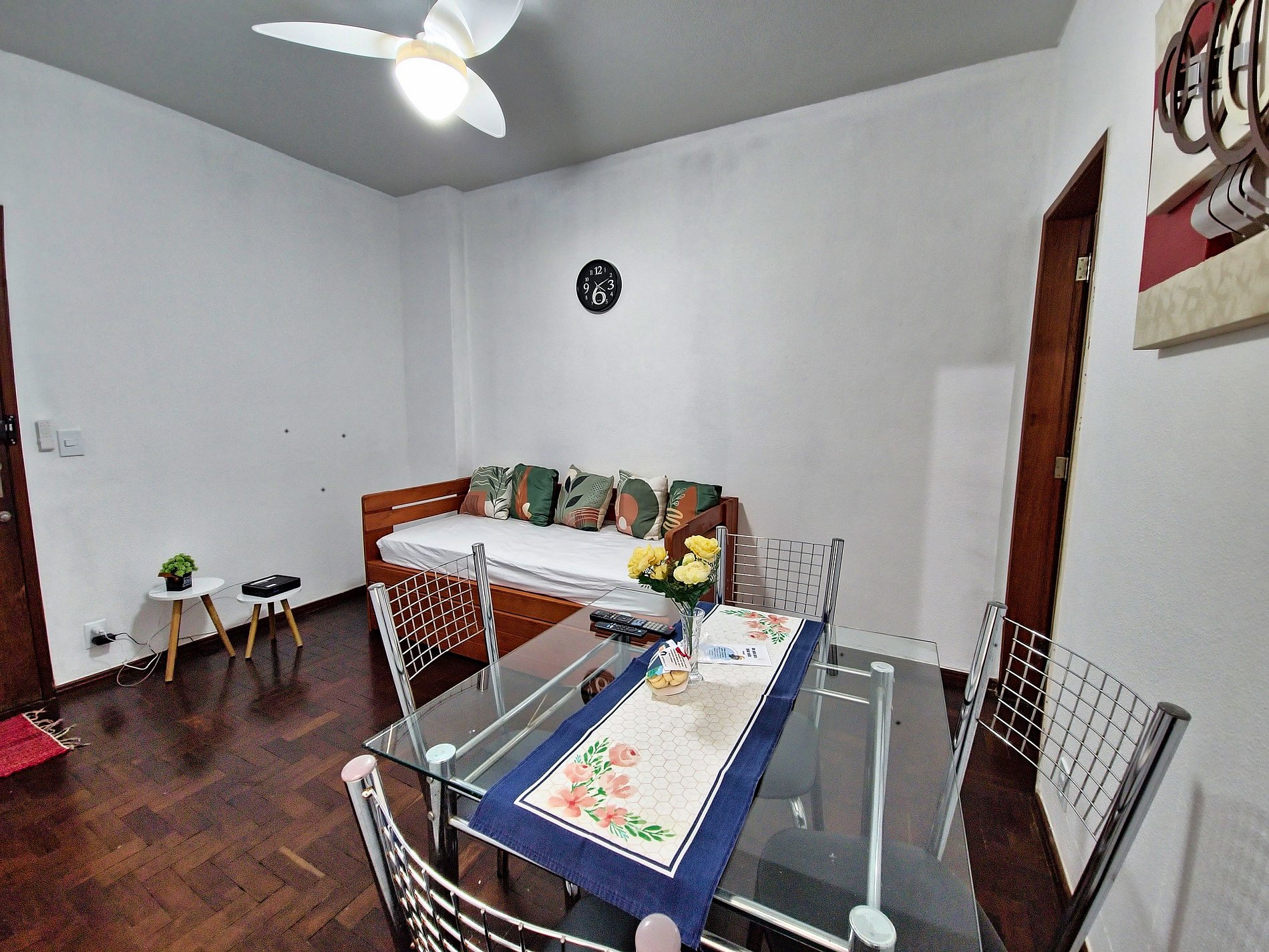 O apartamento possui um quarto com cama de casal e ventilador de teto, sala com sofá-cama, ventilador de teto, Smart TV e mesa para quatro pessoas, além de uma cozinha completa com geladeira, micro-ondas e fogão de 4 bocas. Fornecemos roupa de cama e toalhas limpas e higienizadas, garantindo conforto e bem-estar durante toda a estadia.
