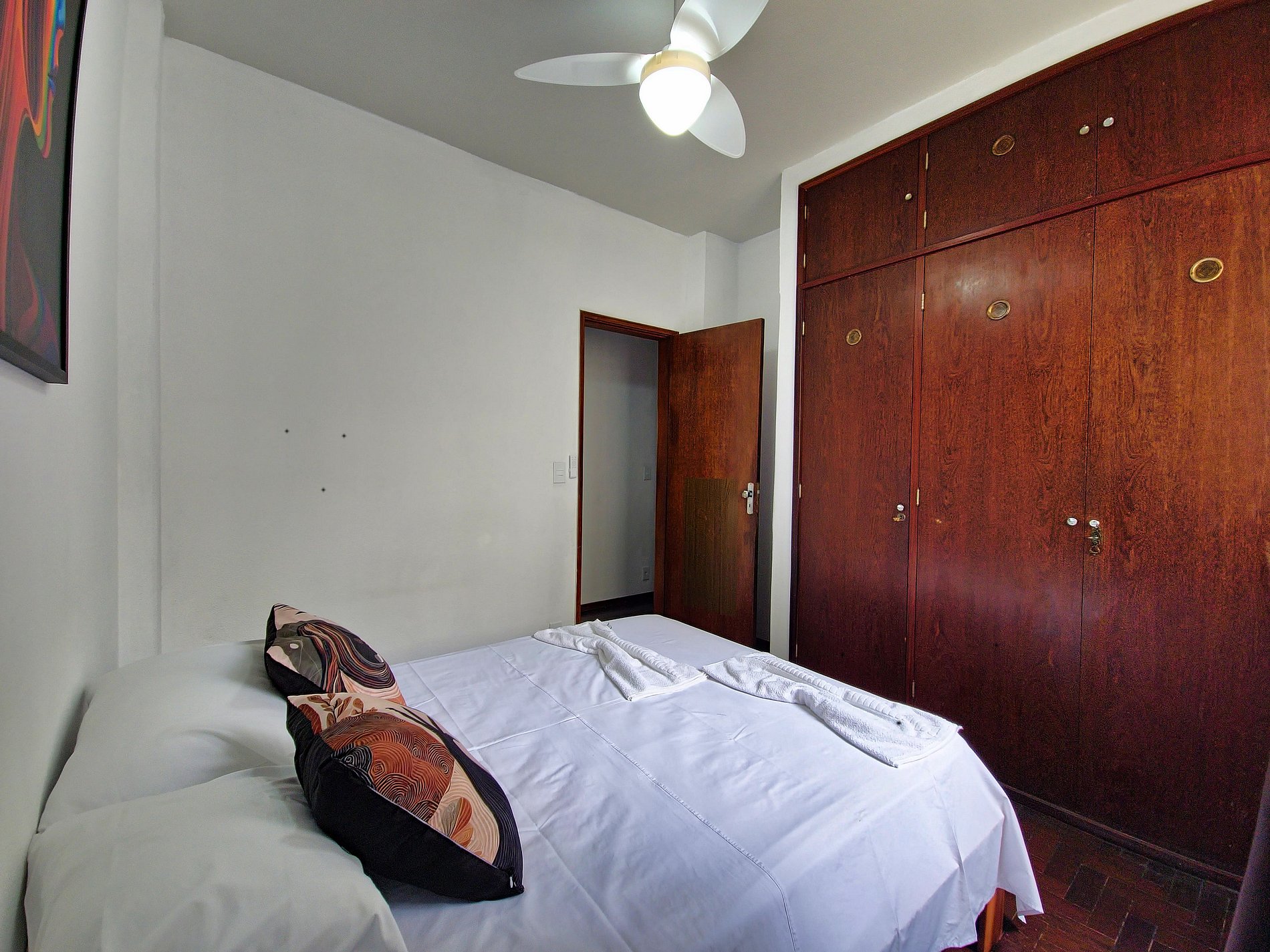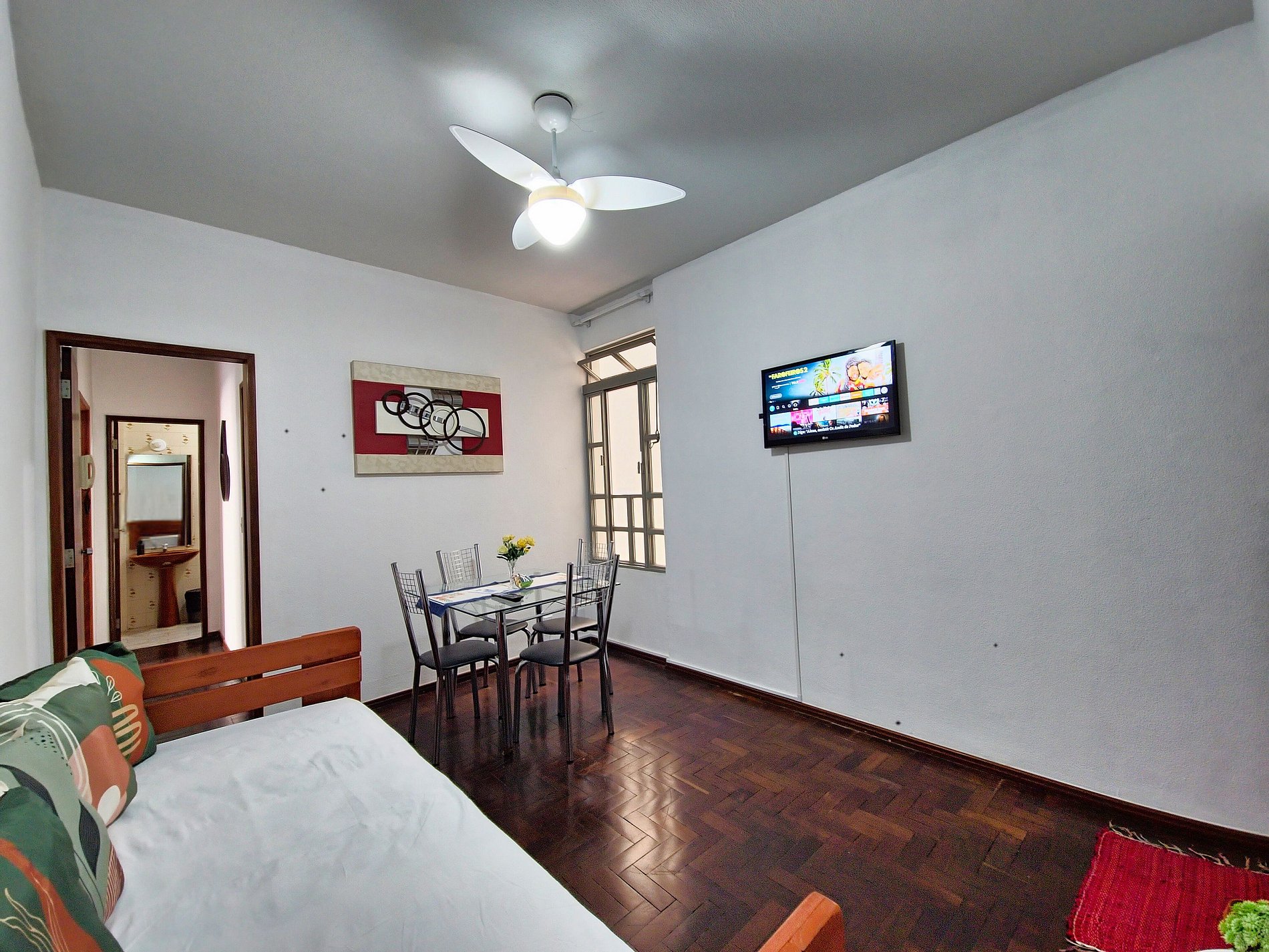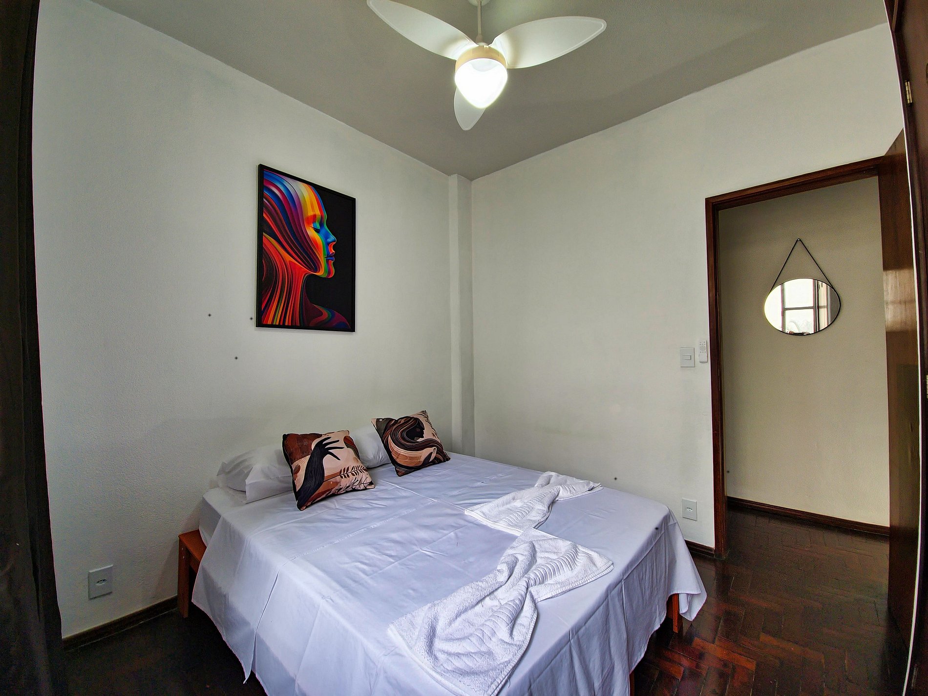 O apartamento possui um quarto com cama de casal e ventilador de teto, sala com sofá-cama, ventilador de teto, Smart TV e mesa para quatro pessoas, além de uma cozinha completa com geladeira, micro-ondas e fogão de 4 bocas. Fornecemos roupa de cama e toalhas limpas e higienizadas, garantindo conforto e bem-estar durante toda a estadia.