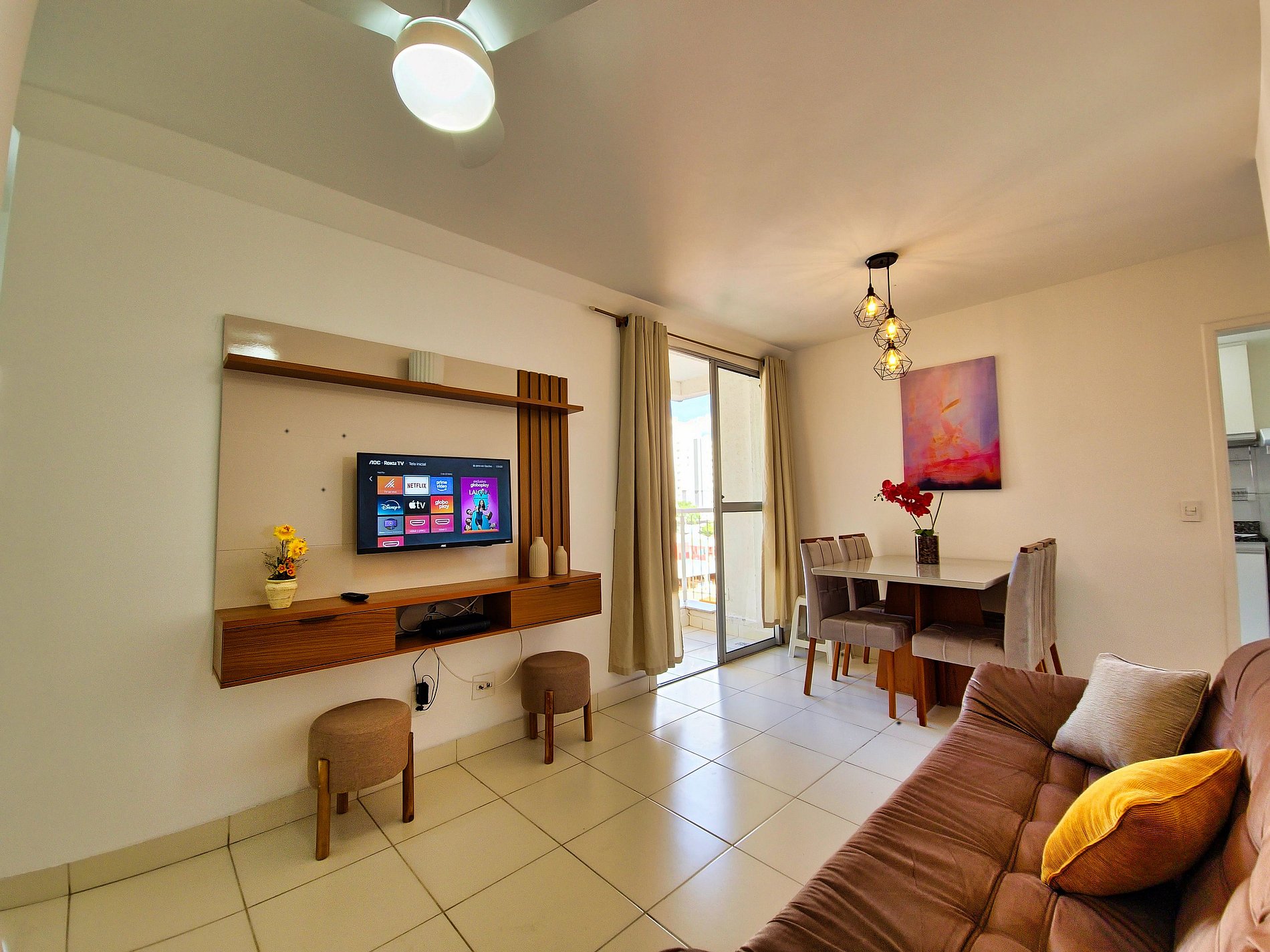 Este apartamento confortável conta com sala arejada conta com sofá, Smart TV, mesa de jantar e uma charmosa varanda para relaxar. A cozinha está equipada com tudo que você precisa para preparar refeições. São 2 quartos: uma suíte com cama de casal, closet e banheiro privativo, e outro com uma cama de solteiro que se transforma em duas. O apartamento ainda possui um banheiro social. Localizado em um condomínio seguro, oferece toda comodidade e praticidade para sua viagem!
