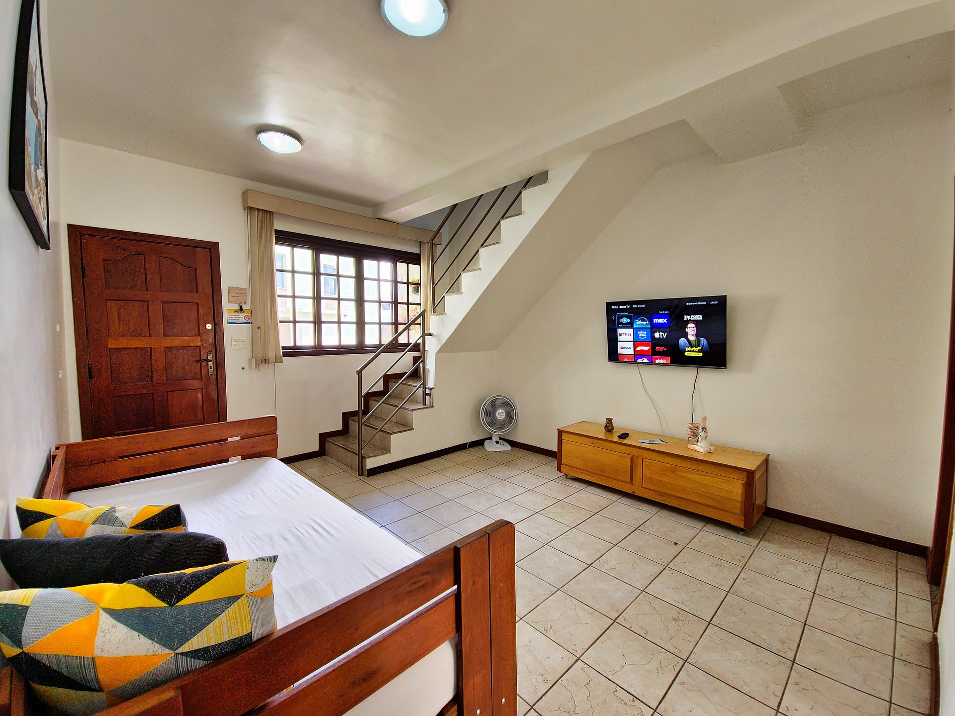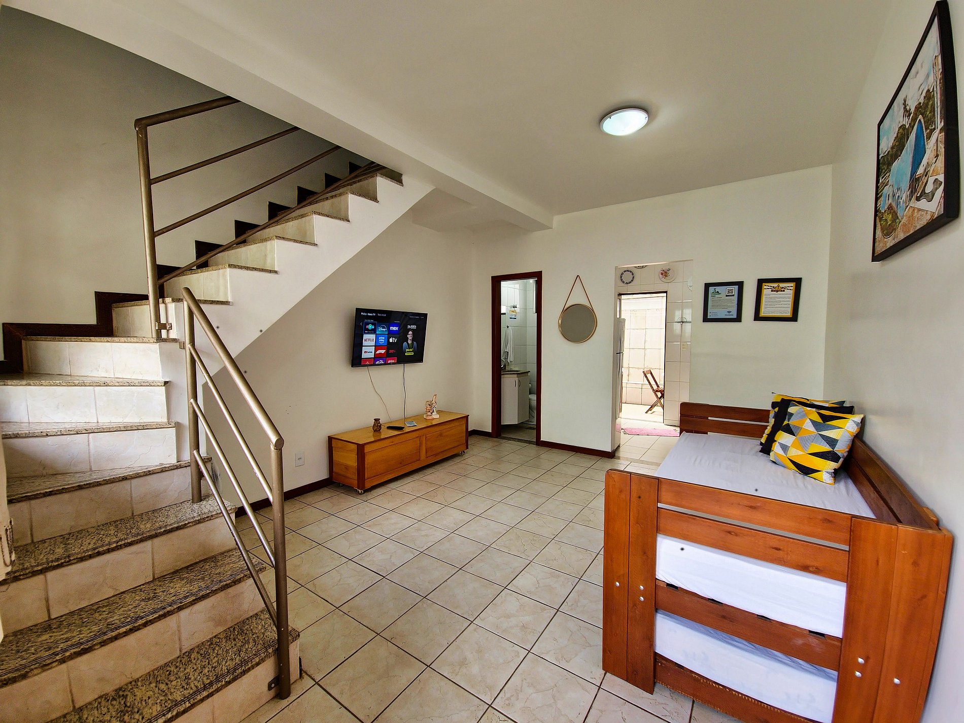 No piso inferior, desfrute de uma sala espaçosa com Smart TV de 43", cozinha totalmente equipada para preparar suas refeições e uma área de serviço com tanquinho, ferro de passar e secador de cabelo. A casa também conta com vaga de garagem, oferecendo ainda mais comodidade.