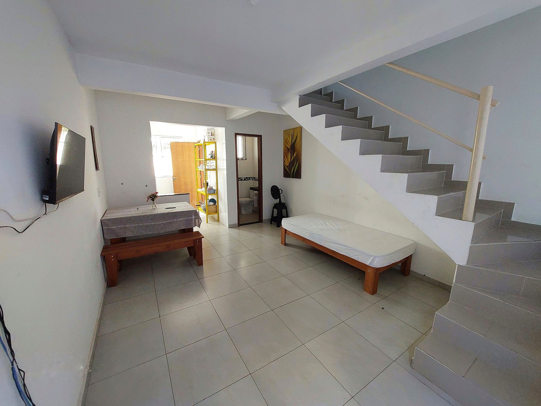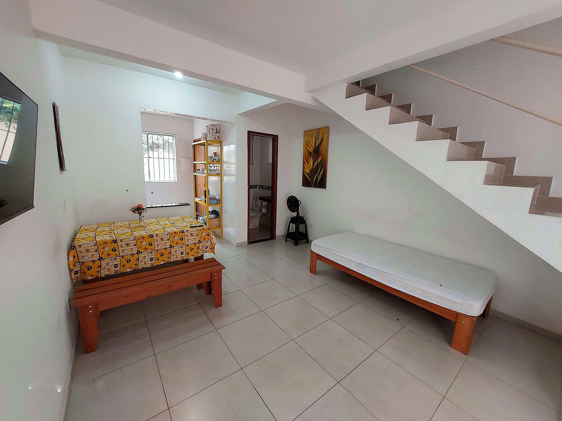 O hóspede terá acesso completo e exclusivo a todas as áreas internas da casa. No piso superior, há dois quartos aconchegantes e um banheiro completo. No piso térreo, há uma sala de estar com uma smart TV de 32 polegadas, uma cozinha completa com utensílios para preparar suas refeições, um lavabo e uma área de serviço com tanque e máquina de lavar roupa semiautomática. Além disso, a casa tem uma pequena área externa privativa com churrasqueira. A garagem para carro fica em uma área comum do condomínio, com portão eletrônico para sua comodidade.