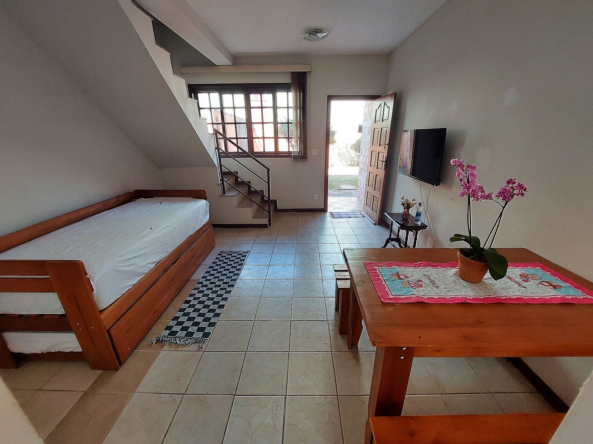 No piso inferior, você encontrará uma sala espaçosa com Smart TV de 43", cozinha totalmente equipada para suas refeições e uma área de serviço com tanquinho, ferro de passar e secador de cabelo. Tudo pensado para garantir o seu conforto e comodidade. A casa também conta com vaga de garagem.