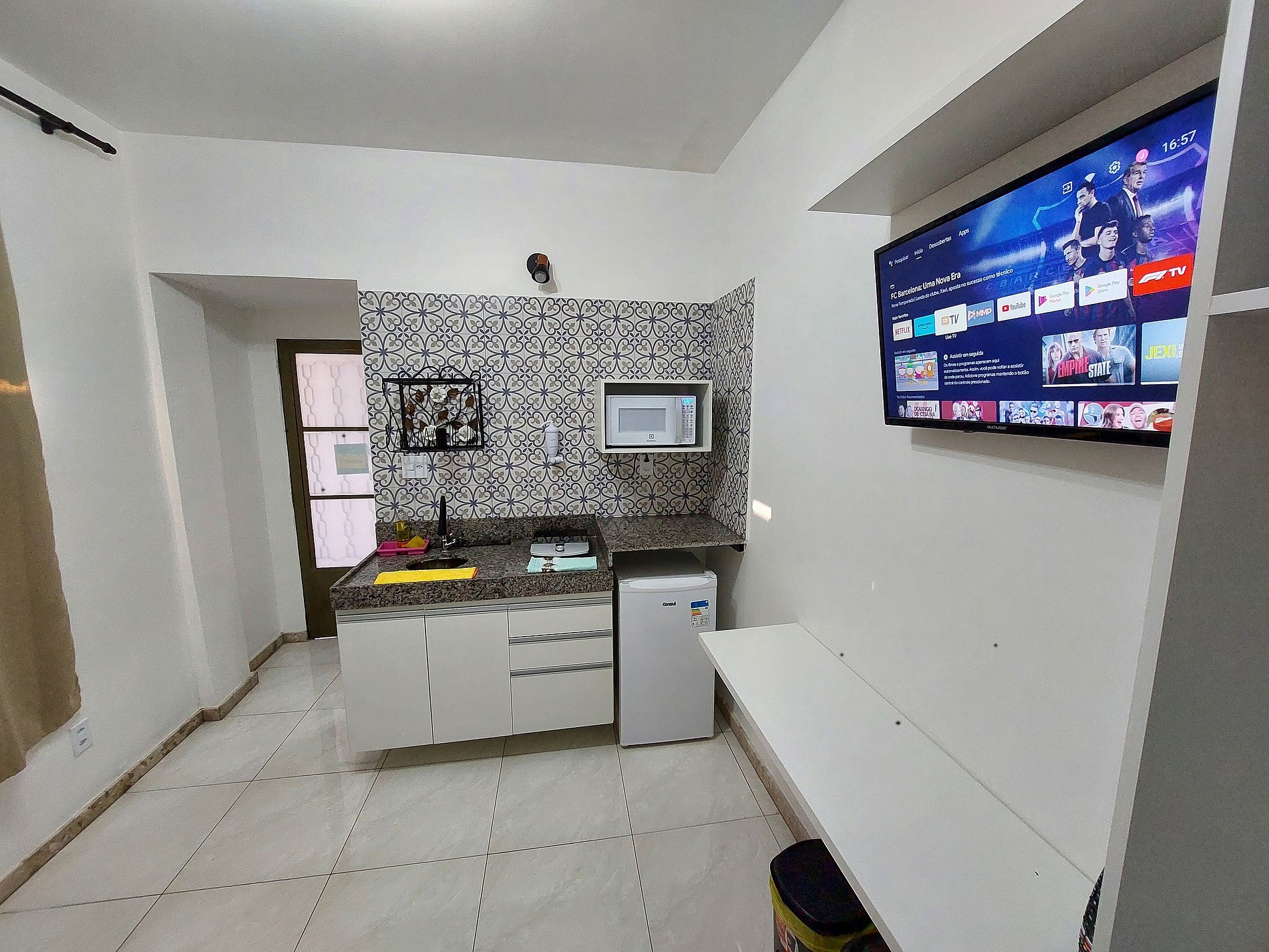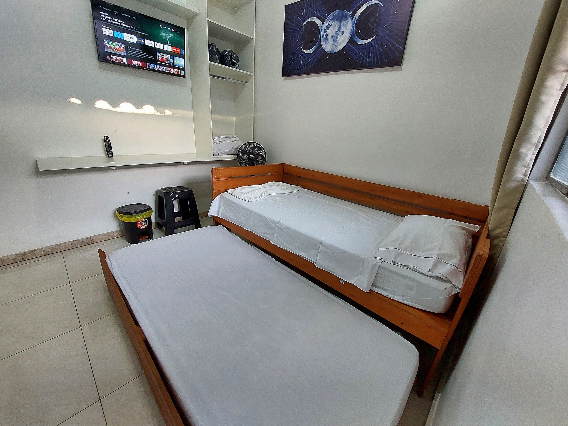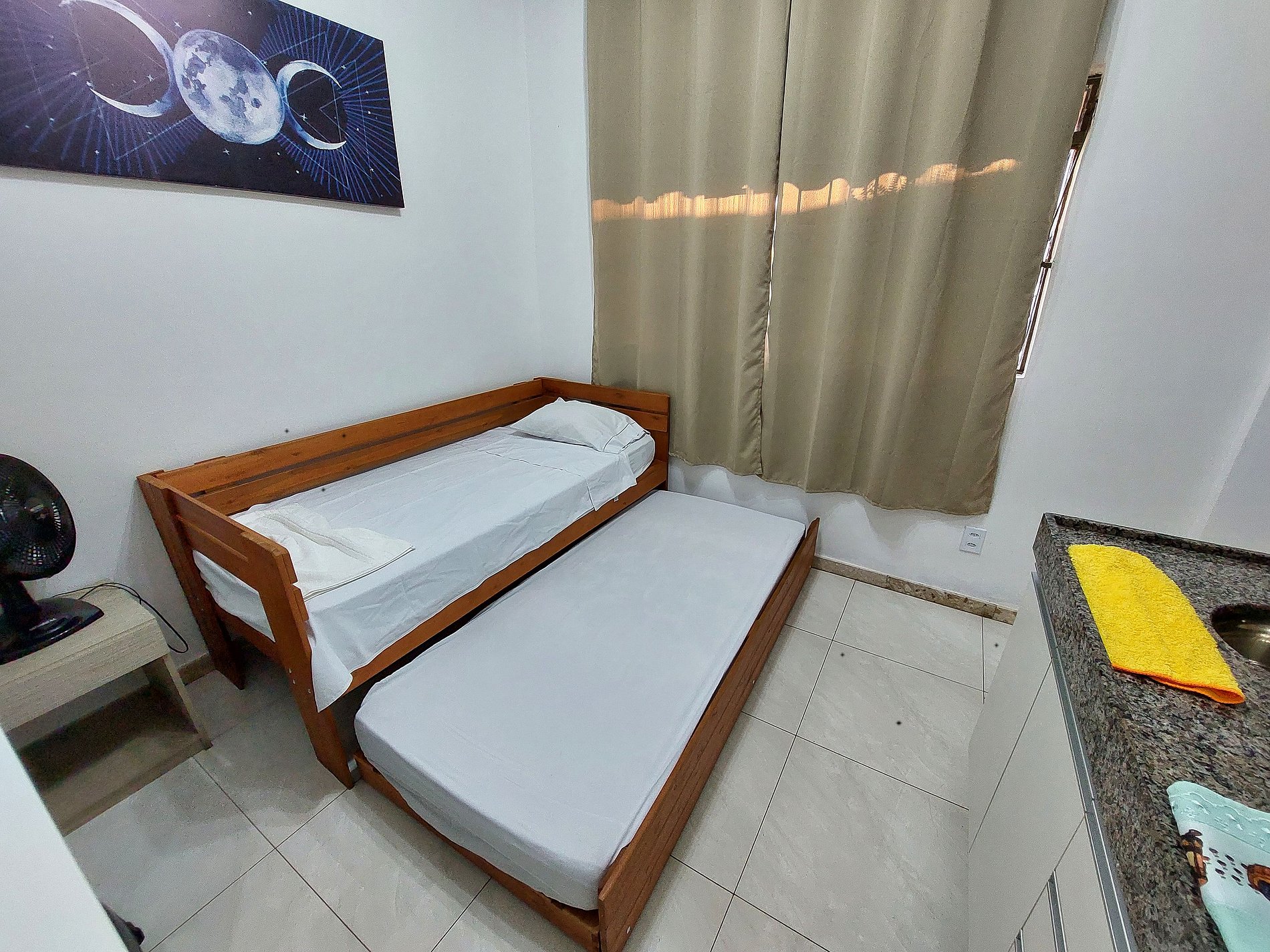 Relaxe neste espaço aconchegante e funcional, ideal para quem busca conforto com estilo. Nossa kitnet compacta oferece duas camas de solteiro no estilo bicama, garantindo uma boa noite de descanso. O ambiente conta com Ar Condicionado, proporcionando ainda mais conforto. A cozinha está equipada com itens essenciais para preparar seu café da manhã e refeições rápidas, como frigobar, micro-ondas e cooktop. O banheiro é espaçoso e moderno, com sistema de aquecimento de água para seu bem-estar.
