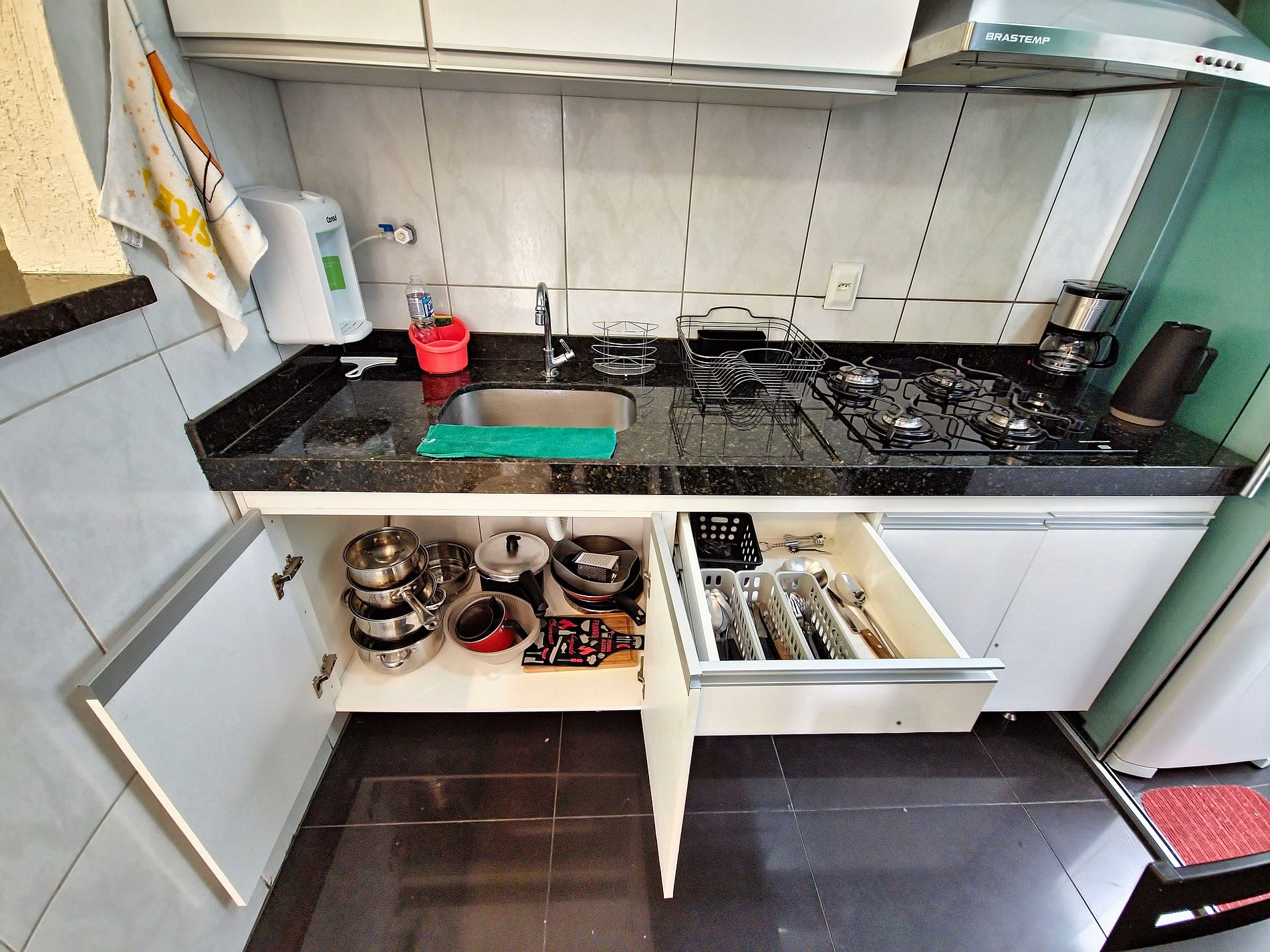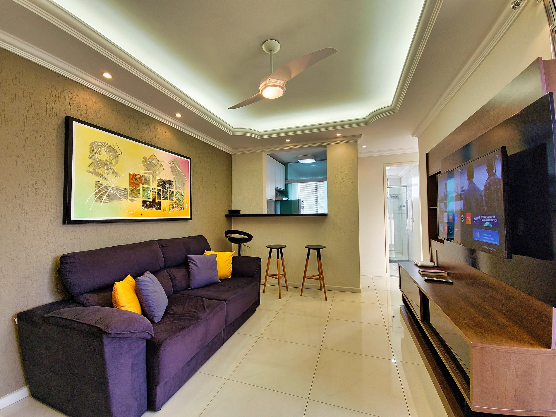 A sala integra conforto e funcionalidade, com um sofá aconchegante, ventilador de teto, Smart TV 43”, banquetas, espelho de corpo inteiro e uma varandinha. A cozinha estilo americana é equipada com tudo o que você precisa para preparar refeições no dia a dia, com diversos utensílios, panelas, copos e taças, além de cooktop a gás, micro-ondas, geladeira, filtro de água e mais.