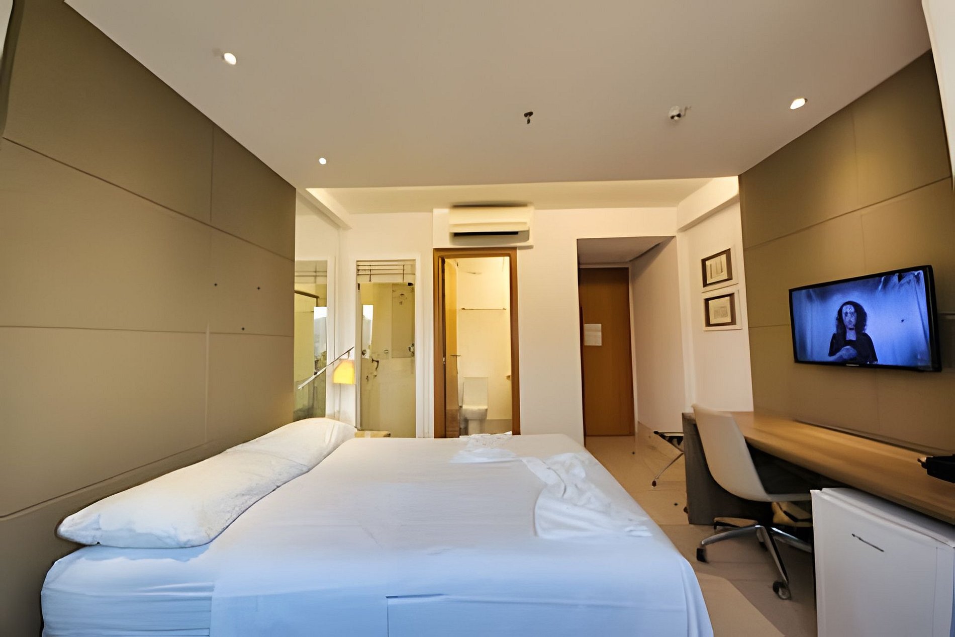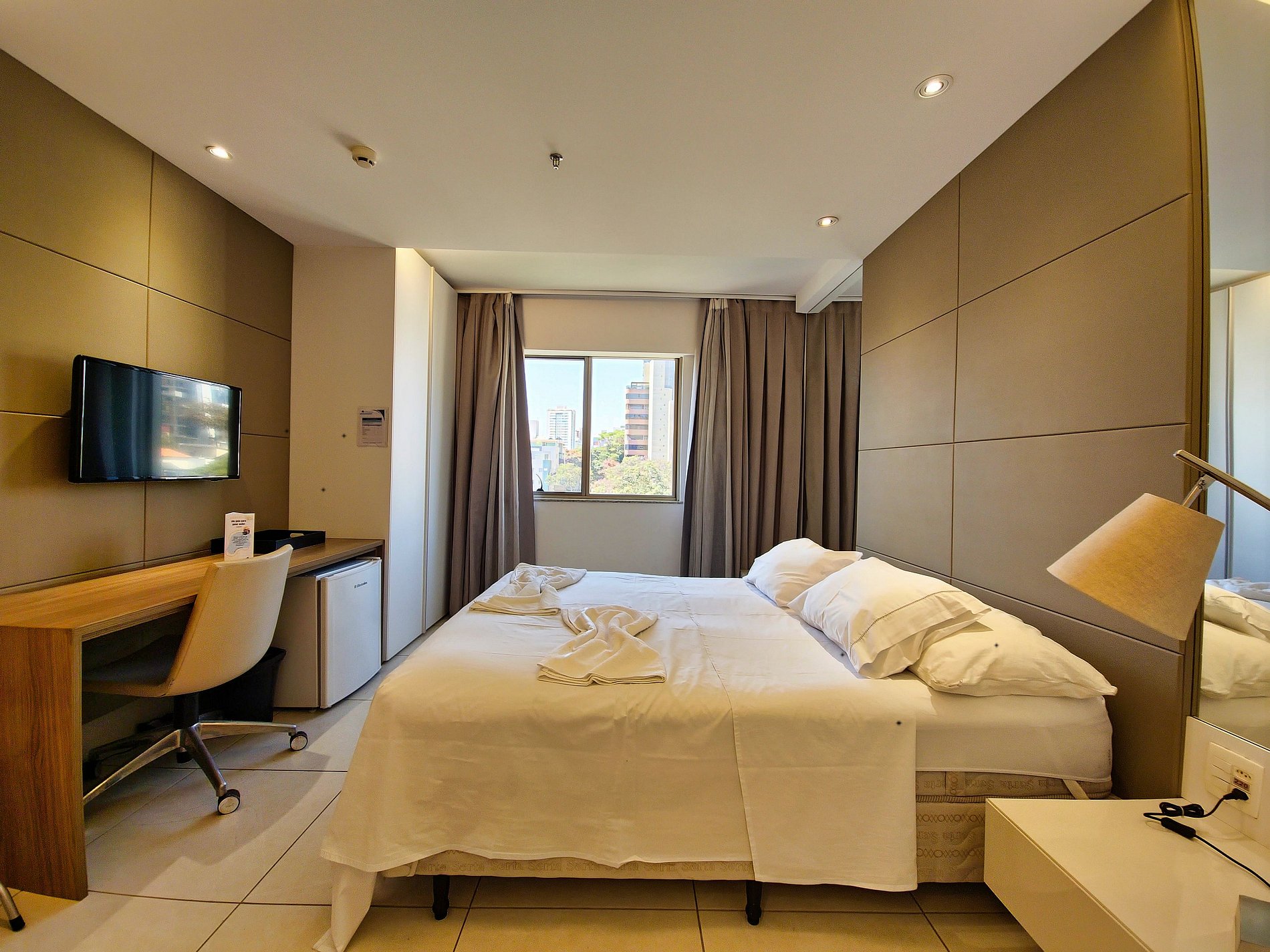 Suíte de hotel moderna e confortável em localização privilegiada de Belo Horizonte, próxima à Savassi e Lourdes. Oferece internet, cama queen com enxoval limpo e macio, ar-condicionado, Smart TV, frigobar e espaço de trabalho. Aproveite a estrutura completa com piscina, sauna, academia e recepção 24h. Próxima a bares, restaurantes e pontos turísticos como a Praça da Liberdade e o Palácio das Artes.
