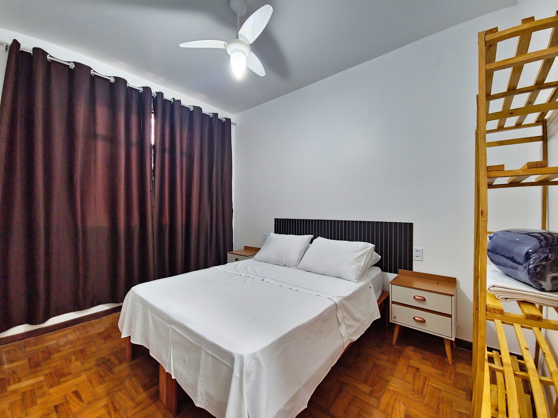 Quarto: cama de casal, ventilador de teto, roupa de cama limpa.