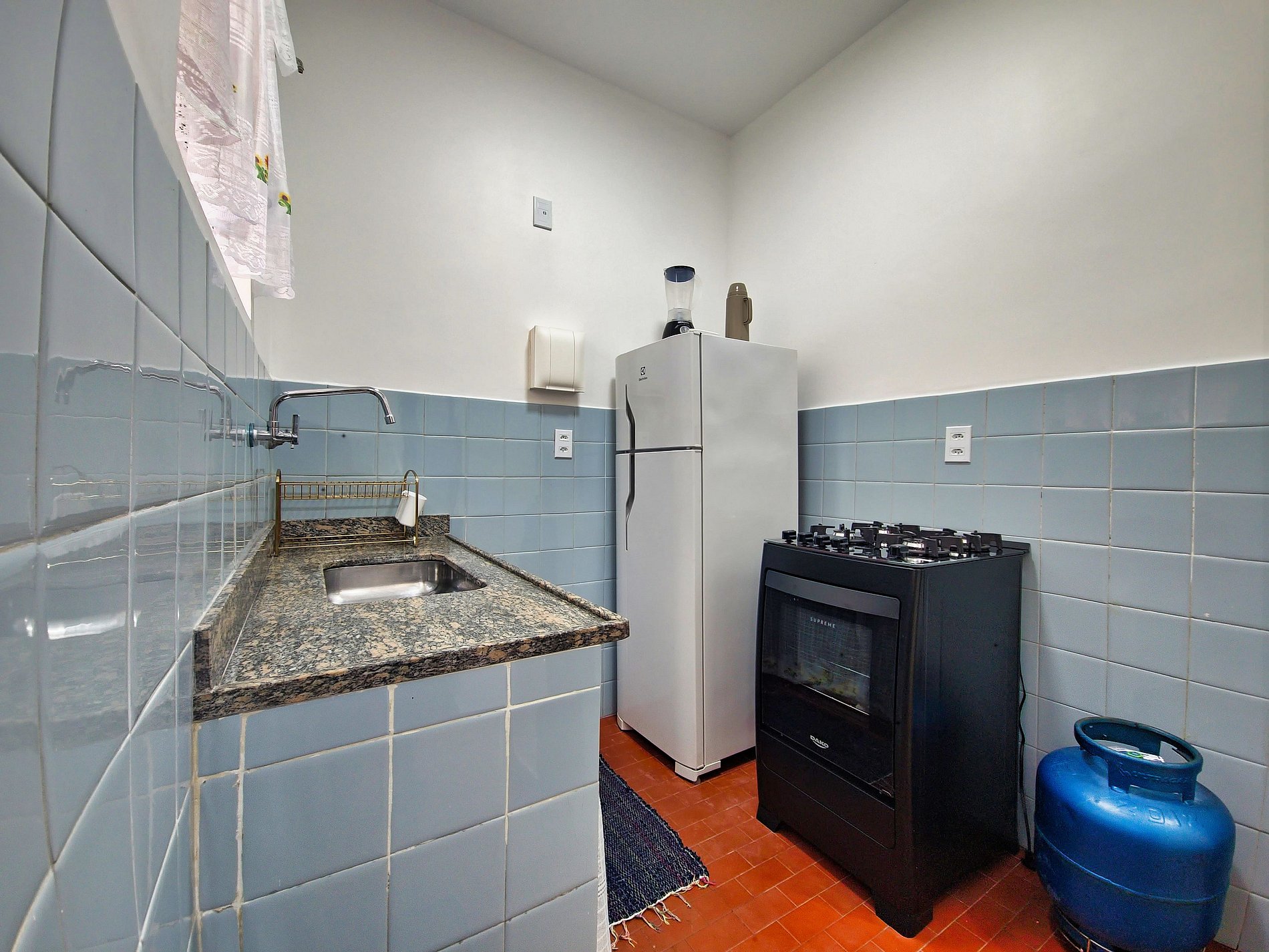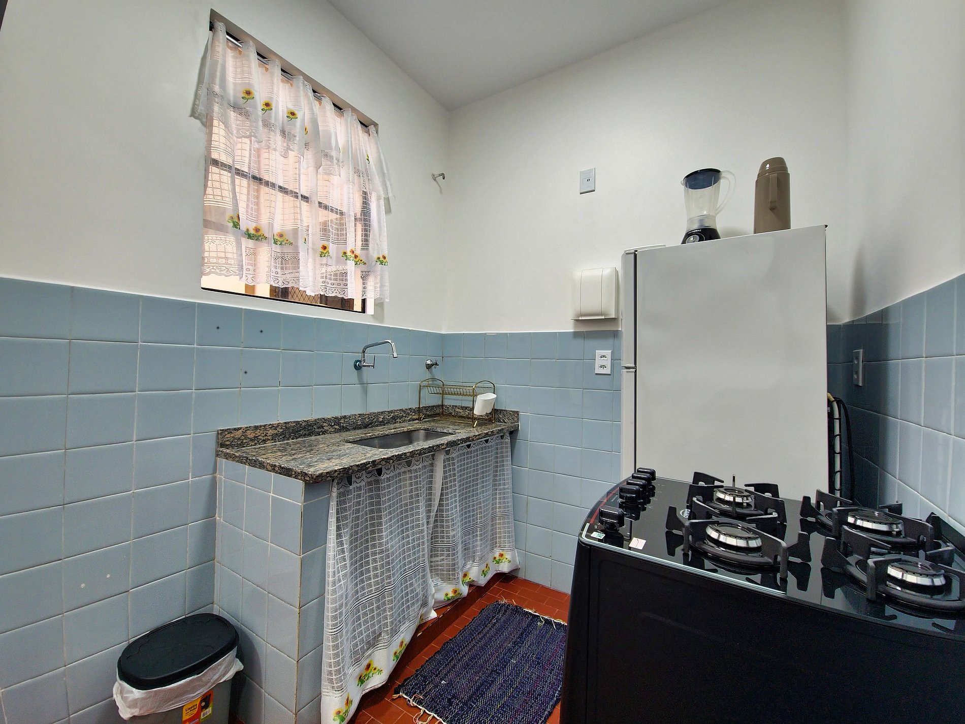 Cozinha: equipada com geladeira, micro-ondas, fogão com forno, panelas, pratos, talheres e utensílios.