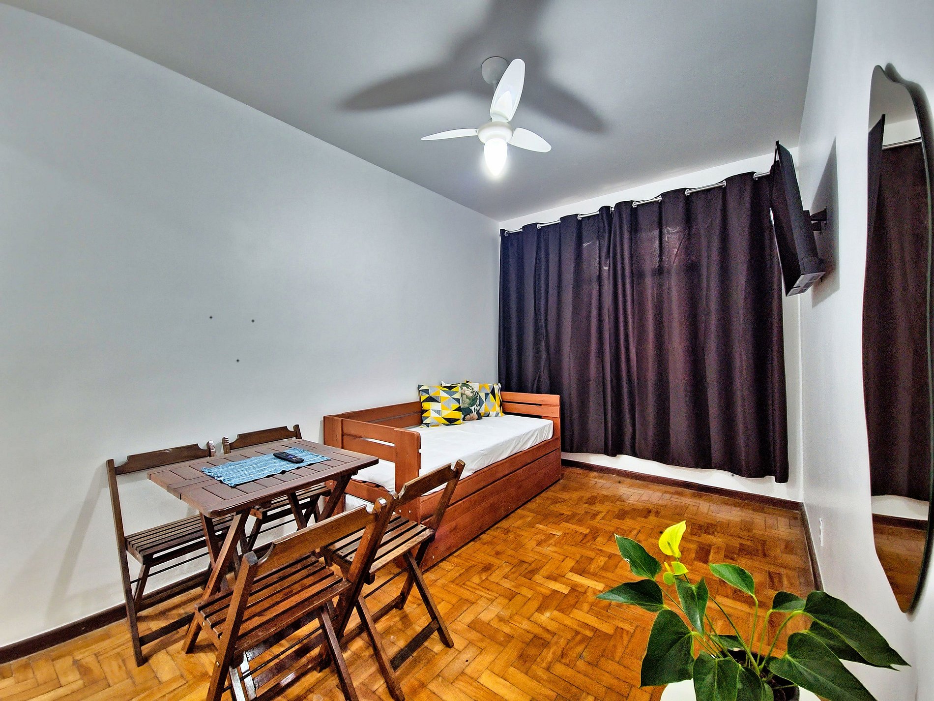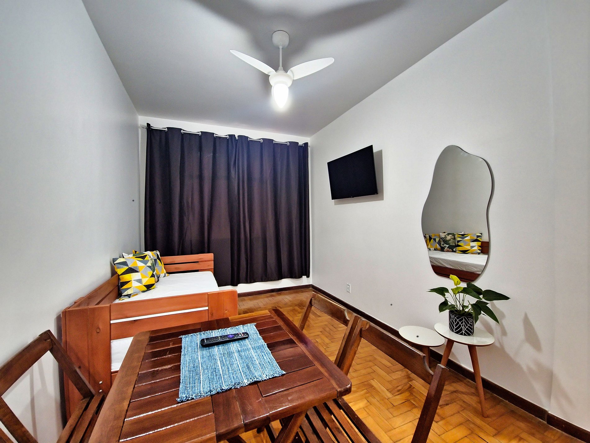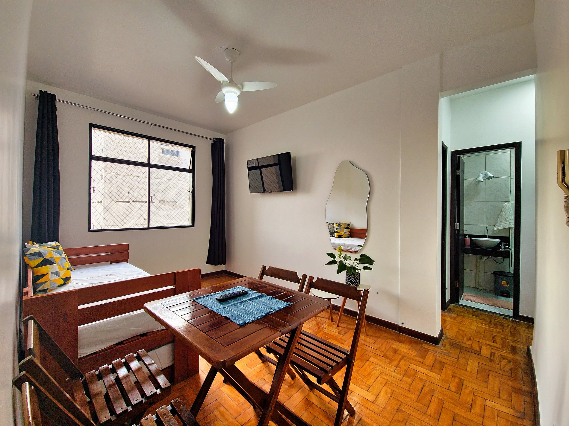 Localizado no coração de Belo Horizonte, este apartamento no 11º andar oferece conforto, praticidade e uma vista privilegiada. Bem iluminado e arejado, conta com um quarto aconchegante com cama de casal e ventilador de teto, sala equipada com sofá-cama confortável, Smart TV de 43” e mesa para refeições, além de cozinha completa com geladeira, micro-ondas, fogão com forno e todos os utensílios necessários para preparar suas refeições. A área de serviço dispõe de tanque e máquina de lavar, e a internet Wi-Fi é rápida para atender tanto lazer quanto trabalho. O prédio possui elevadores e portaria 24 horas, garantindo segurança e comodidade. A localização é excelente: a poucos passos do Mercado Novo (500 m), Mercado Central (600 m), Rodoviária (400 m), Shopping Cidade (750 m) e Praça Sete de Setembro (550 m), além de fácil acesso ao Minascentro, Sesc Palladium, Feira de Artesanato da Afonso Pena e ao bairro Savassi. Nos arredores, há padarias, farmácias, mercados e todo tipo de comércio.