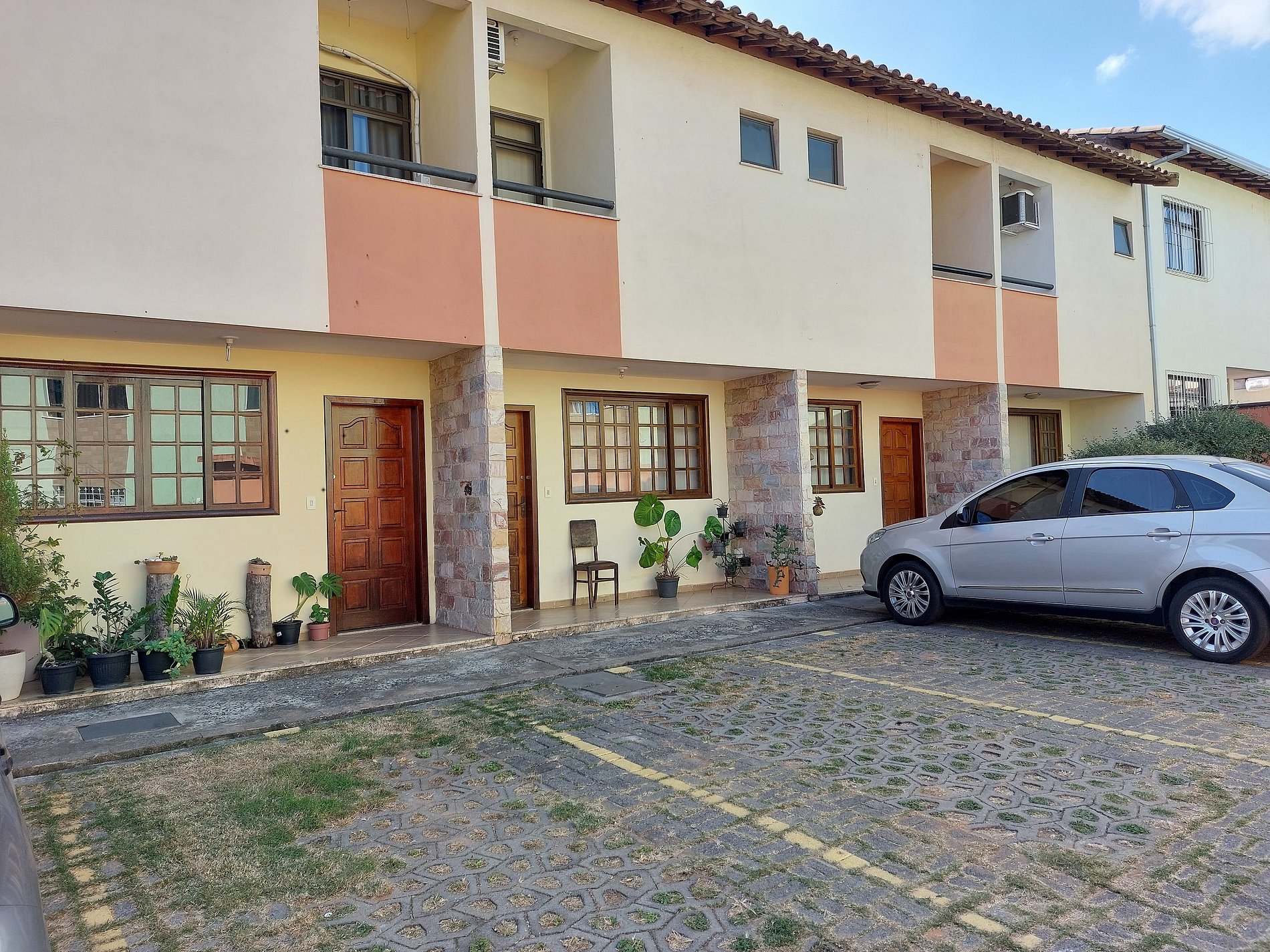 Este condomínio é formado por sete casas geminadas duplex, cada uma com dois pavimentos e paredes compartilhadas, criando um ambiente agradável e acolhedor, perfeito para famílias e aqueles que buscam tranquilidade e segurança. O pátio é adornado com piso intertravado, que além de ser uma escolha sustentável, realça a beleza do espaço, complementado por áreas gramadas. Para a segurança dos moradores, o acesso ao condomínio é controlado por um portão social com interfone e um portão de garagem elétrico, garantindo privacidade e conforto.