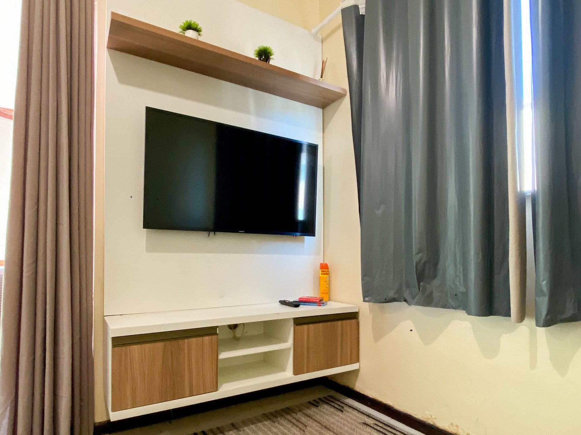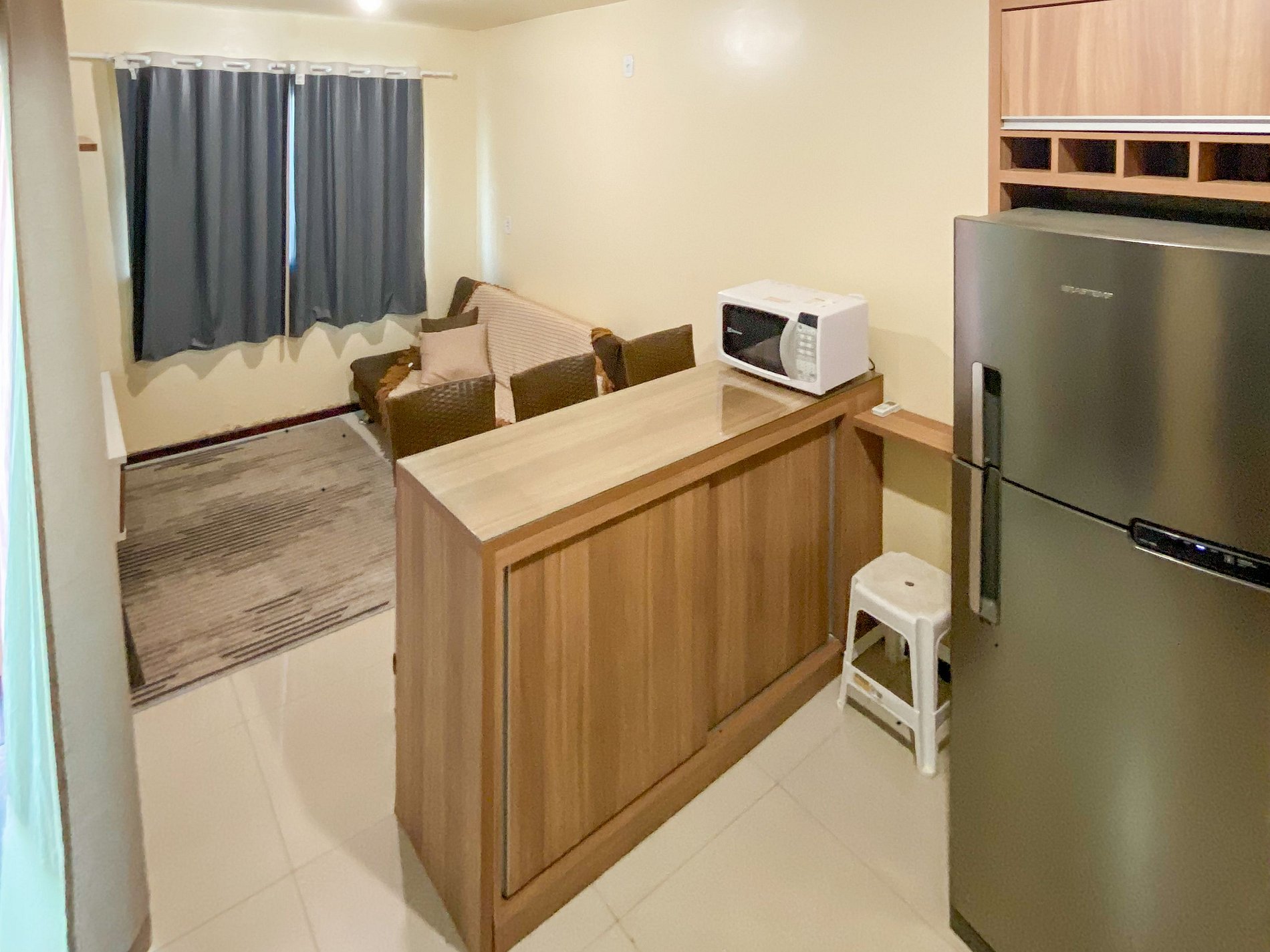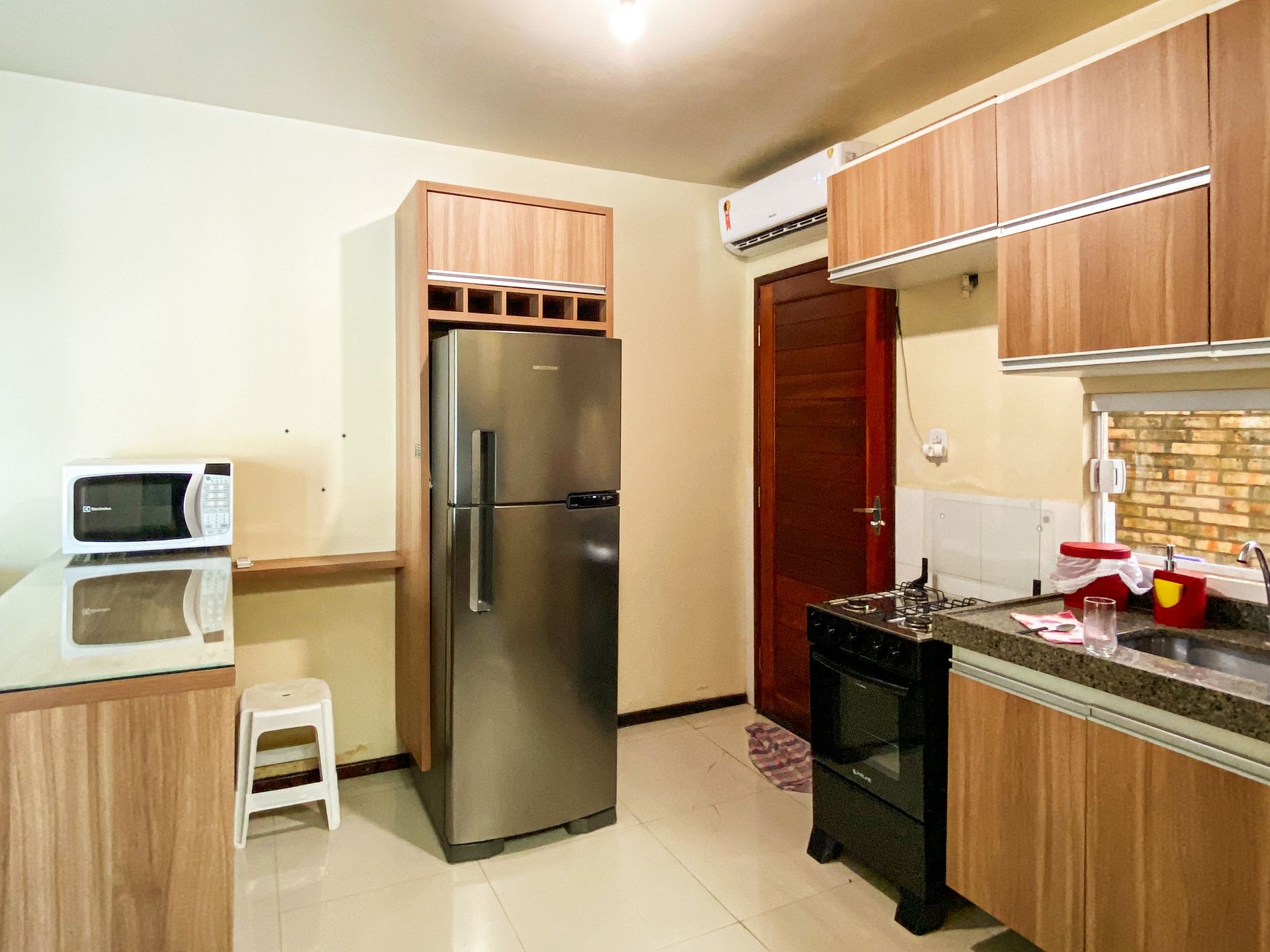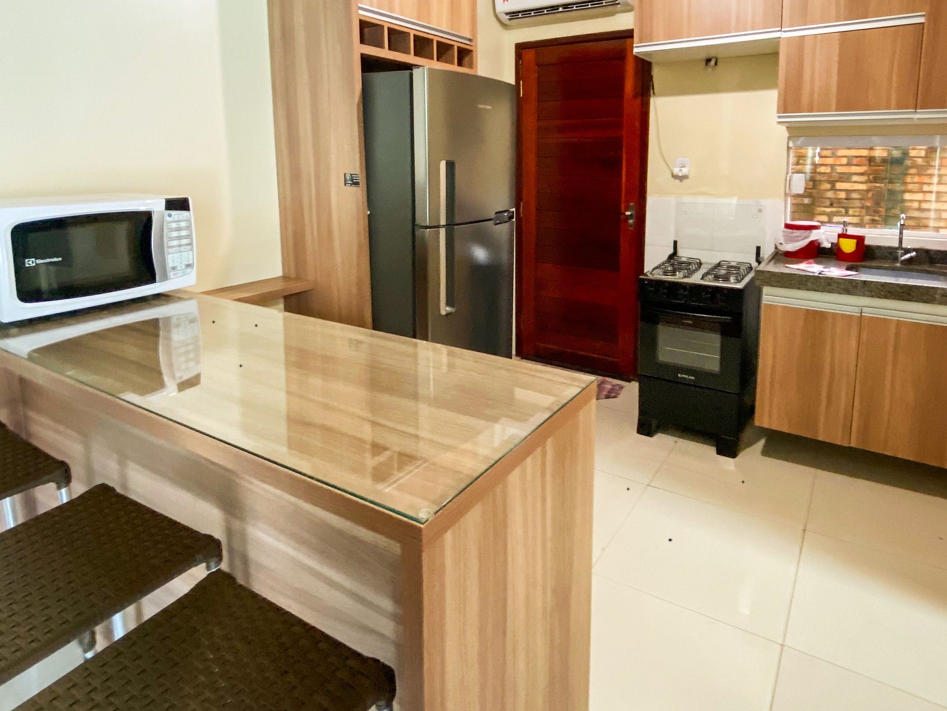 Descendo as escadas, você será recebido por uma cozinha totalmente equipada, pronta para atender todas as suas necessidades culinárias. Equipada com geladeira, fogão com forno, microondas, liquidificador, cafeteira e sanduicheira, a cozinha também conta com a conveniência do ar condicionado. A sala de estar adjacente é o lugar perfeito para relaxar, equipada com um confortável sofá-cama e uma Smart TV de 43 polegadas, ideal para desfrutar de seus filmes e programas favoritos.